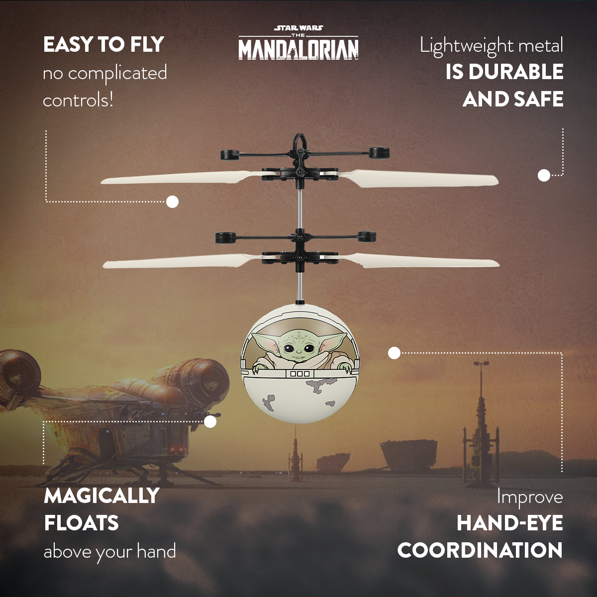 Watch as it flies over your hand for hand-eye coordination and motor skills! Baby Yoda is easy to fly and has no complicated controls, is made of lightweight metal is durable and safe.